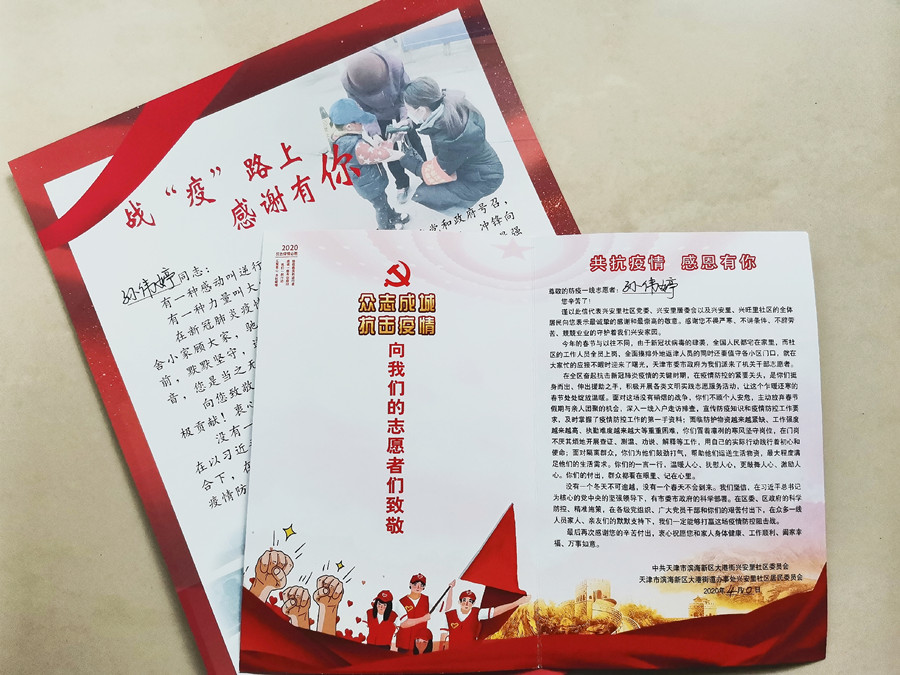 春风拂至,复盛万物;微光汇聚,情暖人间。中国抗疫已经取得了重要的阶段性成果,复工复产也在有序推进。在防疫执勤工作中,我收到了分别来自中共天津市滨海新区区委大港街道工作委员会和社区居委会的两封感谢信,信中表达了对志愿者在特殊时期坚持一线的慰问与感谢。