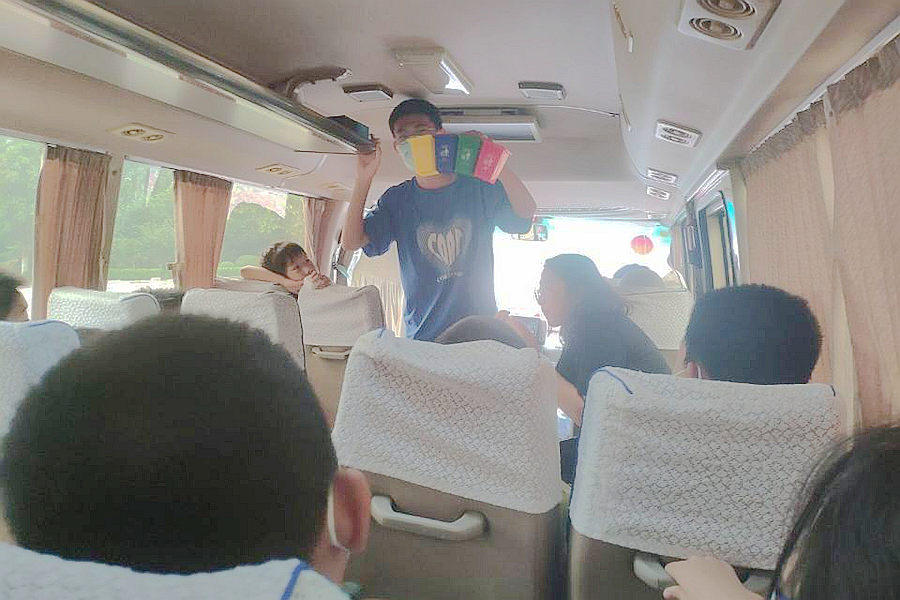 上午九点左右,我们跟随队伍上了车。车上,我们在领队的带领下和希望小屋的孩子们做了自我介绍,相互破冰。我和辛国浩还带着孩子们玩垃圾分类的游戏,这个游戏既拉近了我们的距离,活跃了气氛,也激起了孩子们的兴趣,同时提高了孩子们的环保意识。不知不觉间,司机就告知我们目的地快到了,我们只能在孩子们意犹未尽的目光中收拾道具,提前结束了游戏。