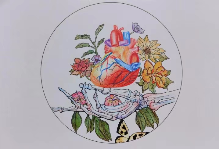 我的灵感主要来源于中国国粹京剧文化,将中国传统文化京剧中蝶姿手势与人类心脏进行有机结合最终绘制而成。作品中,传统文化与解剖图的结合独具韵味,手部呈蝶姿托起心脏,四周以生机勃勃的花与蝴蝶作为衬托,象征生命的美好与宝贵。希望能够通过该作品彰显出医者仁心,呼吁人类以爱与关怀呵护生命,以善与责任爱惜芳心。