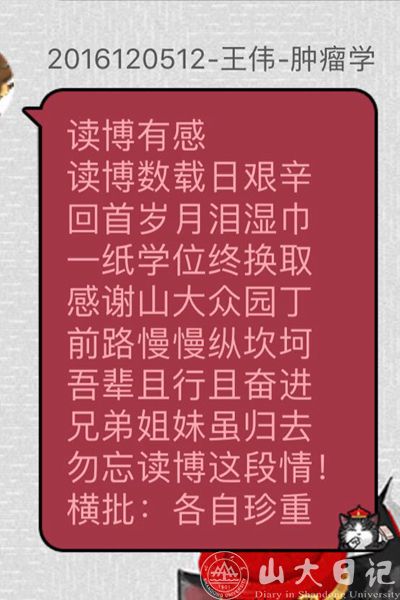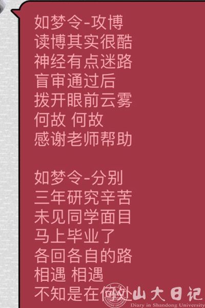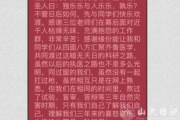 群里兄弟姐妹们从3月份提出学位论文答辩申请,到半个月前陆续拿到论文外审的结果,再到一周内的答辩,直到今天下午学术不端行为检测(查重)结果的导入。当他们一脸懵圈地群里@我(木木老师),问我下一步该接受怎样的“磨炼”时;当他们获知自己距离学位帽、学位服、学位证就一步之遥时;当我这个群主“木木老师”略微提前恭喜了他们一下时,群里竟然毫无预警地热闹了起来。一位老同学私下给我留言:群里学生们说终于见到他们的“木木”老师温柔了一回;又一个学位申请过程中频频出“状况”的女生提议群中潜伏的“文人墨客”赋诗一首。然后,文言文、现代诗,抒情的、写实的此起彼伏。作为一名科班出身的医学生,作为一名进了山东大学门就“蛰居”在趵突泉校区静悄悄儿待着的“老人儿”,我竟不知你们除了手术刀还惯用键盘鼠标,竟不知你们除了治病救人还喜欢吟诗作对,竟不知你们习惯了辛苦还练就了苦中作乐!同学甲,你称我们辛勤的园丁!褒奖了!同学乙,你夸我们漂亮,有小心动!谬赞了(虚伪地说)!同学丙,你说木木老师终于温柔了一回!恭喜你,戳中要害,让我陷入反思。