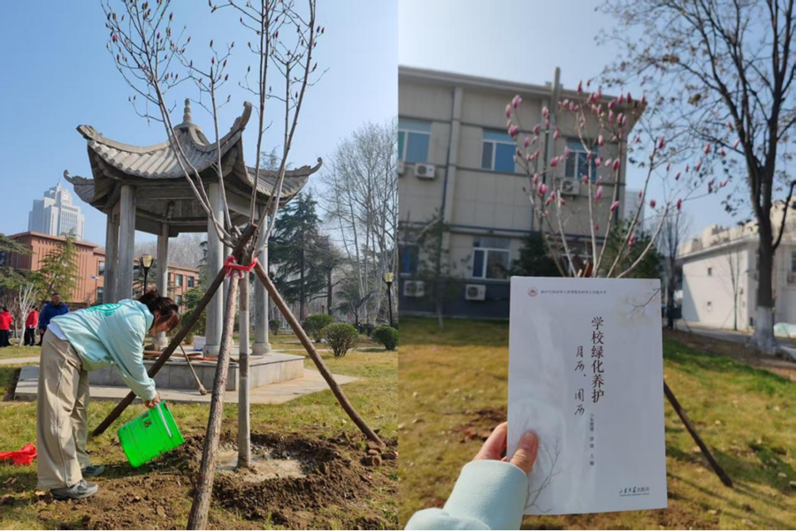几分钟后,直径约50厘米的树坑终于大功告成。在坑内先回填部分熟土后,树苗也成功入坑。我们把树苗扶正,围堰浇水。玉兰的花苞在春风里轻轻晃动,我们和小树一起合影留念。绿化工作人员帮我们浇水、支好支架,领导老师给我们赠送了《学校绿化养护月历、周历》,内页有校园里四季各种植物的照片。我想这也可以作为小树日记,以后常来看看、记录。