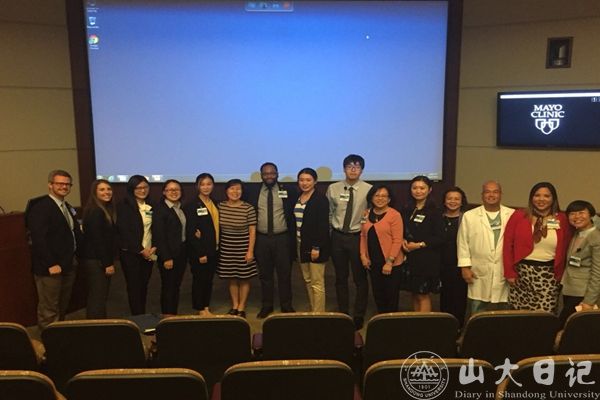 今天,是一个非常值得纪念的日子!山东大学医药卫生管理学院的6名同学经过3个月在北佛罗里达大学的刻苦学习,6个周在梅奥医疗中心争分夺秒的实习,在今天梅奥的大礼堂进行了一场创世纪的精彩演讲,整个演讲过程完全可以用惊艳来形容!前来聆听演讲的梅奥高层、医生,护士、还有管理人员都给予了高度评价!看着同学们在台上用流利的英语侃侃而谈,从容不破地回答各种有关中国医药卫生系统的现状、将来、以及正在进行的医疗改革,还有中美两国医药卫生相关数据的对比,我是打心底里自豪和骄傲!看,这就是俺们山大的风采!