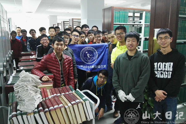 11月12日,为了改造五层闭架书库,给同学们创造更多特色体验空间,图书馆要调整过刊,将五层的过刊全都移至一层密集书库,那么厚的过刊,还要按顺序下架、上架,连续干了几天后,你们加入到了搬运大军中。因为来之前,跟你们的联络员说,都是力气活,最好来几个男孩。你们的带头人到了便说:“老师,您看,全是男孩,有力气,能干活,26个,够不够······”连续搬运了一个多小时,发给你们的线手套都汗津津的了,我问你们,需要给你们开服务证明吗?你们摆着手,说,老师我们不要证明,给我们和图书馆一块拍个合影吧,你们还有这么多书,我们下午还来帮忙!那时,我觉得自己很狭隘,一张服务证明能说明什么,你们来,只是因为你们是山大的一员,你们爱图书馆,你们想要付出。