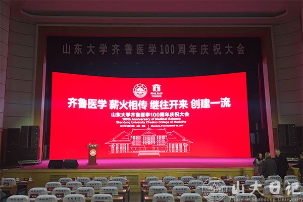 进入南郊宾馆大厅,映入眼帘的是“山东大学齐鲁医学100周年庆祝大会”的宣传展板。这面展板专门为签名而设计,到场的嘉宾老师们都可以在展板上签名,送上自己的祝福。进入会场,屏幕上的“齐鲁医学,薪火相传,继往开来,创建一流”的标语代表了各位与会的嘉宾、老师与同学们的殷切企盼。会场的布置十分大气,工作人员工作有条不紊,学生志愿者服务热情洋溢,让我们每个人都预想到了庆典的成功。