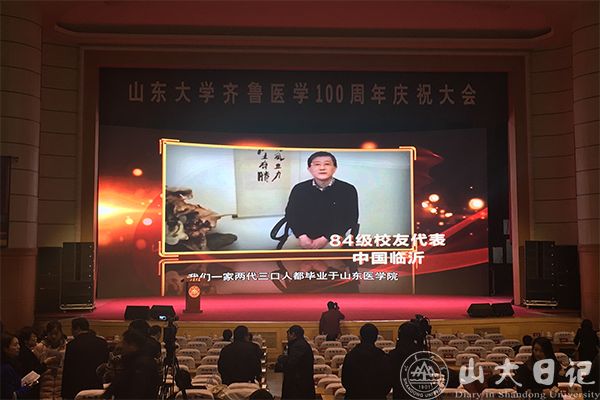九点半庆典准时开始。庆典依次播放了与会友好高校代表名单、友好合作医院及机构名单、校友祝福视频、学校领导老师祝福视频等。其中,让我感受最深的是来自山东临沂的一位1984级校友代表的发言。他说,他一家两代三口人都毕业于山东医学院,也就是如今的山东大学齐鲁医学院,感谢母校对他全家三口人的培养。