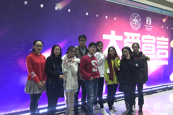 节目顺利结束了,我跟大家一起走到剧院大厅合影。我想,今天的经历是多么的有意义,我相信我一辈子都不会忘记。最后,再一次祝福我们的齐鲁医学一百周年快乐!