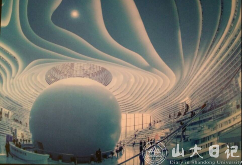 排了一会儿长队,我们终于进入图书馆里面了。在图书馆一楼大厅正中央,游客刚进门就能看到一个圆形的大球,非常炫酷,设计的很棒。该图书馆由荷兰MVRDV建筑设计事务所与天津市城市规划设计研究院建筑分院合作设计,设计立意“滨海之眼”和“书山有路勤为径”。建筑层数共6层,天津滨海新区图书馆以一个“眼睛”的形状镂空在整栋建筑的一至三楼间。其中眼球,也就是我刚才提到的圆形大球,是一个球型的多功能展演厅,被全白色的梯田书架包围。开放式的文化空间上方布满由内到外的环形曲线,如梯田一般层层叠叠,意为无穷无尽的文化海洋。