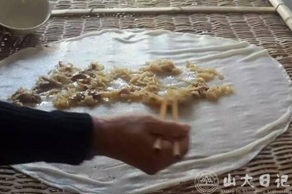 奶奶取出米箕,用筷子在米箕四周轻划一圈,把一层粉面轻轻地撕下来(挑皮),平摊在竹帘上。奶奶事先炒了一些萝卜丝、豇豆等菜肴作为菜馅儿,再添些料,卷成卷,就成功了。