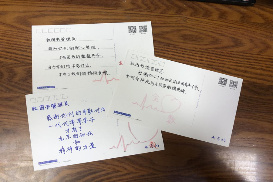 在与同学们的交流中,我感到既意外又感动,意外于他们对我们工作的了解之深,感动于他们对我们工作的认可程度之高。作为一名普通的图书管理员,我每天做着平凡的工作,借还书、整理书、解答读者的咨询、帮助读者处理遇到的问题以及其它一些日常性事务,日复一日地与图书和读者打交道。在山东大学这所国内重点大学里,这些平凡的工作内容与教师们的教学和科研相比,真是不足挂齿。没想到,这些毫不起眼的琐碎工作都被学生们看在眼里、记在心里了。拿在手中的这些明信片在我的心里是沉甸甸的,它们对我而言,是一份份鼓励和鞭策,激励我在未来的工作中更好地秉承“读者第一、服务至上”的原则,更加耐心周到地为师生读者服务,扎扎实实地做好本职工作,为推动图书馆快速发展尽自己的绵薄之力。