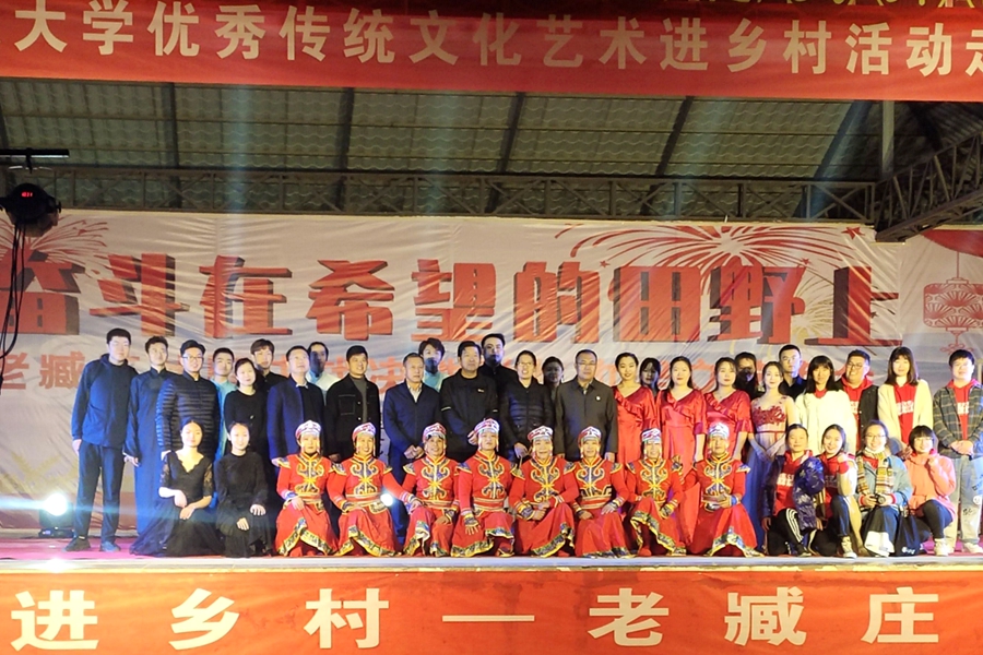 距离晚上七点开始的演出,只有三个半小时的时间了。师生们不顾长途旅行的疲劳,一下车便投入到了紧张的节目彩排中。晚上七点,主持人宣布晚会正式开始。老臧庄社区文化广场上挤满了前来观看晚会的当地群众。11月中旬的中原大地夜晚,气温已比较低,演员们的演出服又都是轻薄材质的短袖衣衫,在后台候场的同学们,身着羽绒服用于保暖。在舞台上,他们用精湛的技艺与饱满的热情,为观众呈现一个个精彩的节目,博得台下观众的阵阵掌声与叫好声。伴随着《在希望的田野上》歌声响起,台上台下演员与观众共同演唱,将晚会的气氛推向高潮。晚会结束,已是夜晚九点。