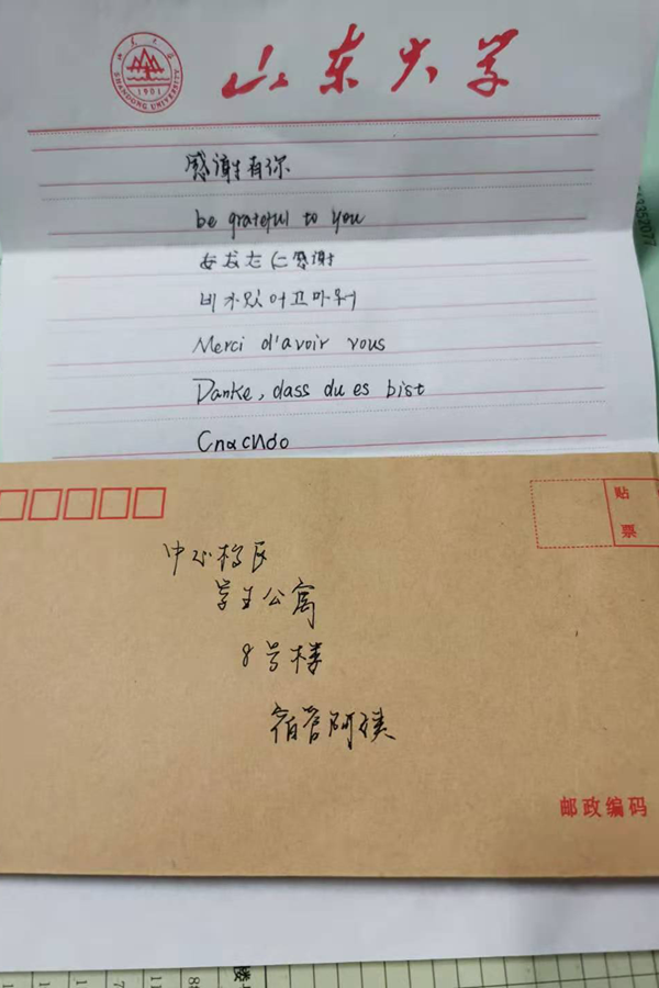 “阿姨,感谢您一年来的关心照顾,让我们在这里的生活很温馨,感受到了家一般的温暖。”话语刚落,孩子们就递过来一个信封。打开信封,里面有一张信纸,信纸上用七种不同国家的语言写着“感谢有你”。尽管我不懂外语,但也从心里感到高兴和温暖,因为我的工作得到了同学们的认可。