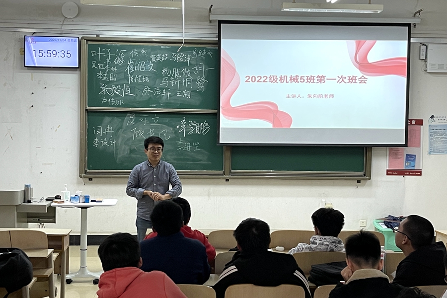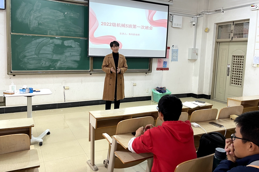 学校的公示发布不久,朱向前老师就迫不及待地想和同学们见面,并且邀请了2022级辅导员朱泉宇老师参与本次班会。在班会上,我真切地感受到了朱向前老师对同学们的关心和热情。没有预想中的严肃紧张,朱老师始终以朋友般的方式跟我们交流。班会刚开始,他就询问大家在生活和学习方面有什么不便之处,一场“吐槽小会”就迅速拉近了大家跟朱老师的距离。随后,朱老师幽默地讲述了他自己的大学生活,为大家提供宝贵经验,帮助大家解决问题。