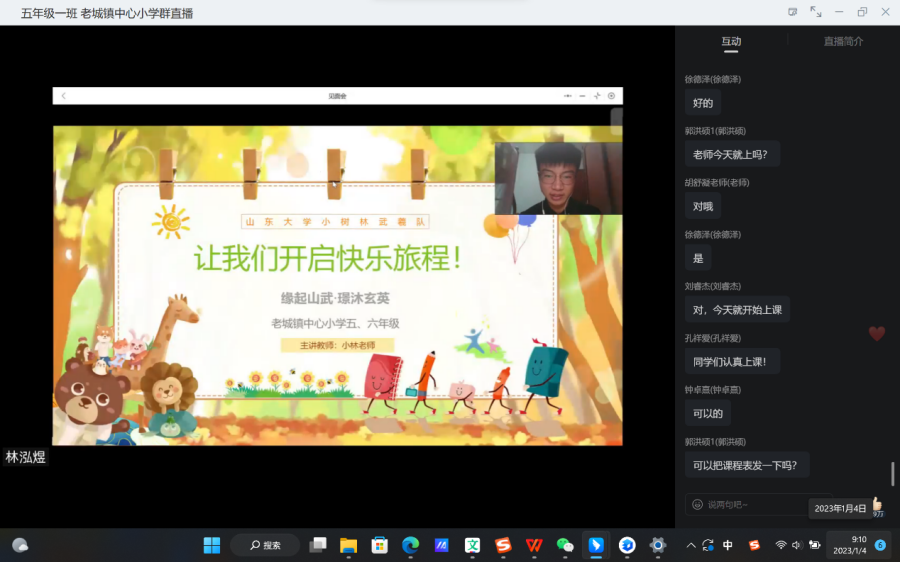 我向大家介绍了团队的基本情况、课程设计和授课安排,团队成员向大家作了自我介绍。武羲支教队10名队员,将在未来七天通过“云教学”的方式,为德州市武城县老城镇中心小学五、六年级的一百五十余名孩子带来“语数外知识补充+素质拓展”的多样化课程。