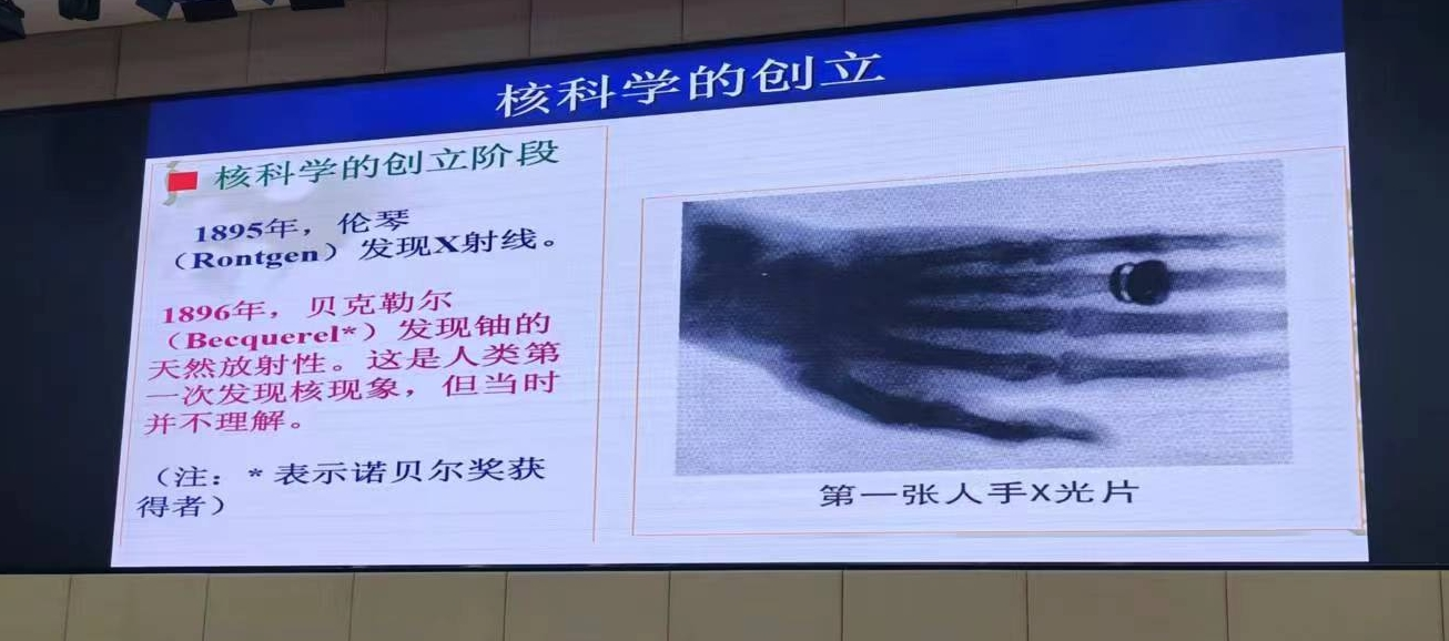 紧接着,王教授就核科学的创立阶段为我们展开了讲解。1895年,伦琴发现了X射线。1896年,贝克勒尔发现了铀的天然放射性,这也是人类第一次发现核现象。在王教授的演示文稿中,我还看到了第一张人手X光片。这只骨节分明的手属于伦琴的夫人。可惜当时人们并未意识到辐射的危害性,伦琴夫人创造了历史的同时也应辐射而患病,没过多久便离开了人世。