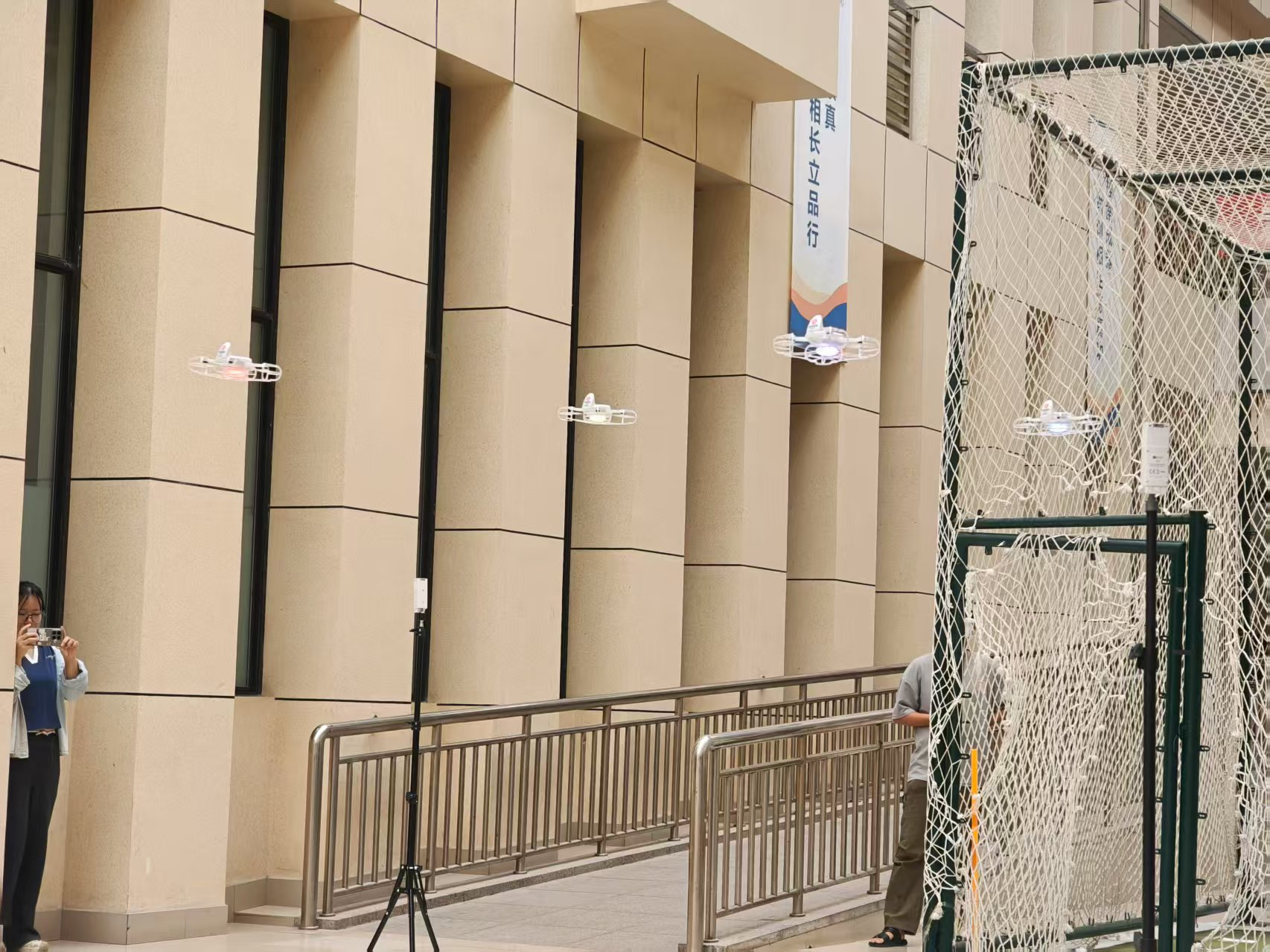 接下来,老师与几位学长为我们进行无人机表演。简单布置现场后,四只无人机同时升空,起初呈现上下左右摆动,接着开始错落有致地转圈。当我以为这已经很厉害的时候,学长们又操作无人机齐齐翻起了跟头,连续稳定又整齐美观,引得在场同学一片赞叹。