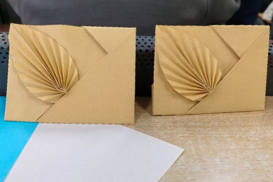 三点活动正式开始,第一个作品是树叶信封。主讲同学举起一张方形纸,他的手指捏住纸的两角,精准地对齐,按压出一条锐利的对角线。然后他将纸翻转、展开,接着捏起另外两角重复动作。我学着他的样子,用拇指和食指钳住纸角,小心翼翼地推动它们向中心靠拢。每折一下,我都用指甲盖沿着折痕用力刮过,让它变得坚毅清晰。纸张在我的手里显得倔强,折痕总是歪斜。我耐着性子,屏住呼吸,按照步骤慢慢地调整,当我终于进行到最后一步,用指尖探入缝隙,撑开,再捏着小角,稳稳地将它推送进去时,一个立体而别致的信封赫然眼前——它真的像一片完整的叶子,有清晰的叶脉纹理。这种将功能与美感巧妙结合的智慧,让我对这项看似简单的手工肃然起敬。