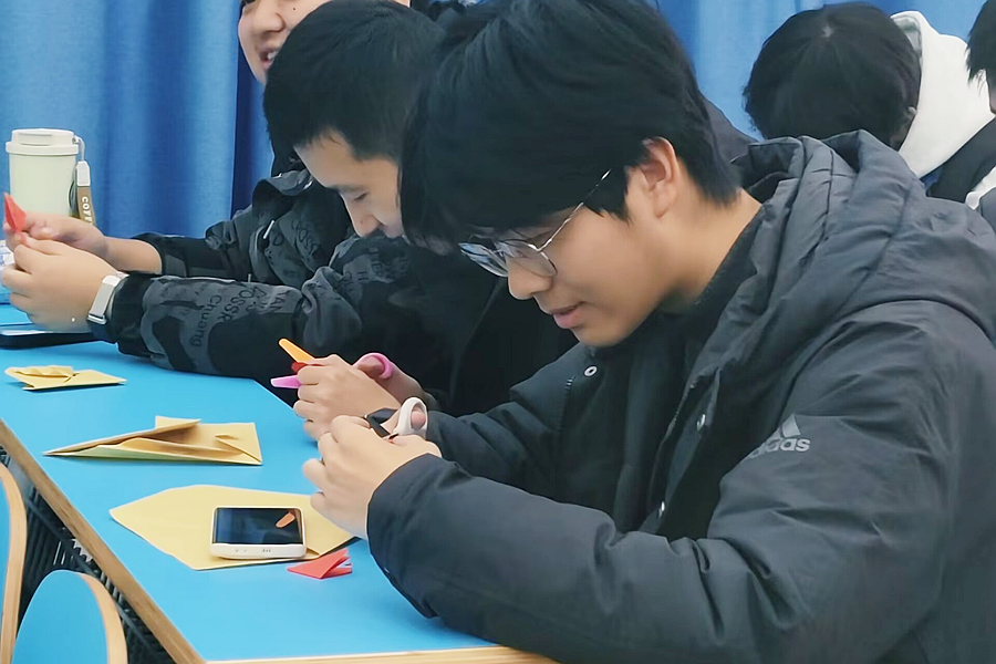 11月21日上午,我们汇聚教学楼5206,期待着剪纸活动的开始。伊始,班委为大家系统介绍了剪纸艺术的历史渊源,提及这门技艺已传承千年,每一款纹样皆蕴含吉祥寓意,如“喜鹊登梅” 寄寓顺遂,“团花” 象征圆满。随后,班委分步演示折纸技巧,从基础的对折到复杂的六角折法,细致讲解纹样绘制的要点与裁剪的取舍原则……一小张纸片中蕴含着如此深厚的文化底蕴。我看向桌子上整齐摆放的红纸,指尖轻触,粗糙厚实的质感间,仿佛承载着千年文化的厚重温度。