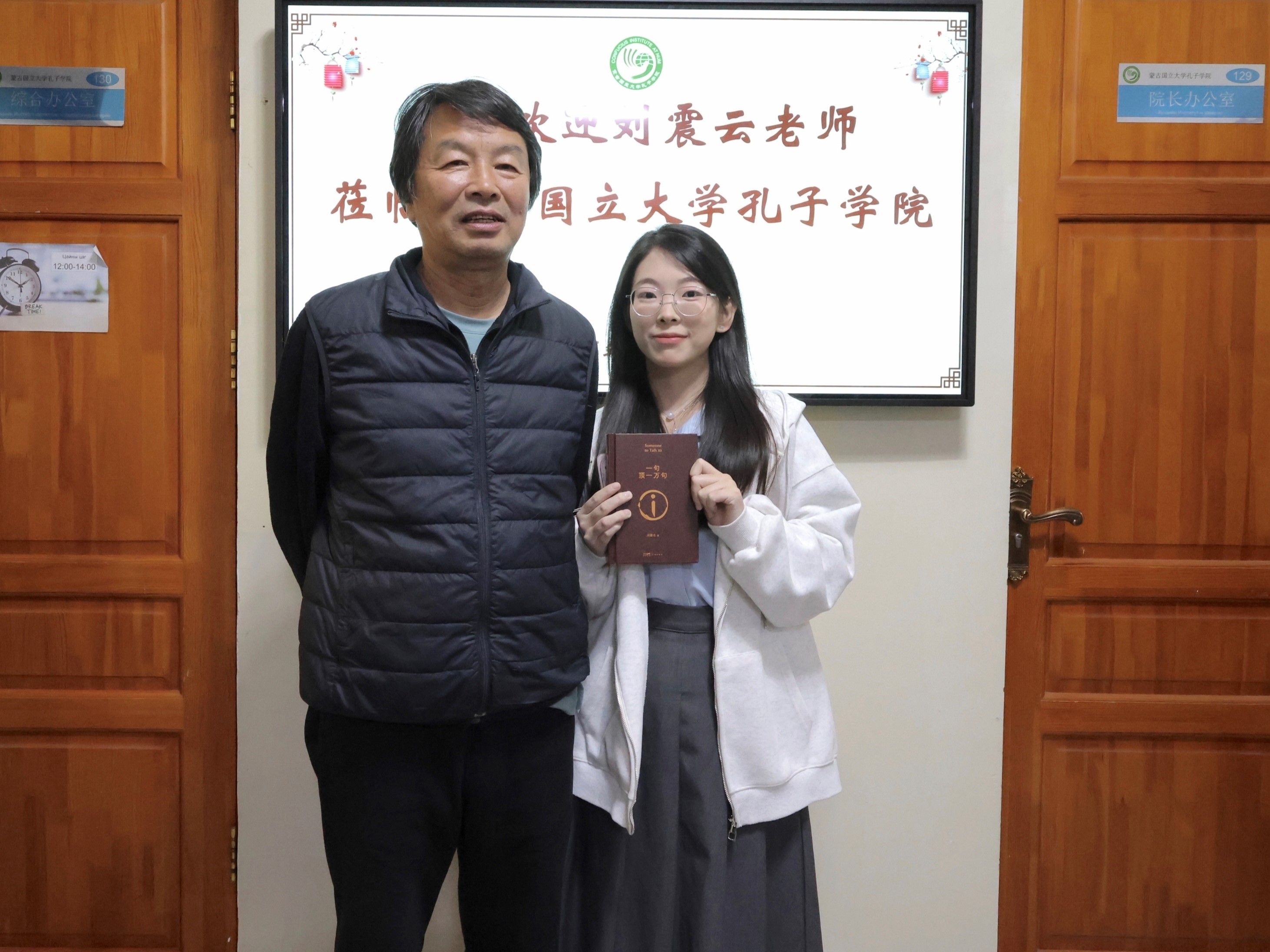 今日,刘震云先生又专程来到蒙古国立大学孔子学院,与孔院教师们面对面交流,先生耐心倾听我们在蒙古一线教学的点滴故事,平实话语里满是对中文教育工作者的理解与认同。在这样静谧而真诚的氛围中,每位教师都得到了刘先生的亲笔签名。我将书递给他时,他抬眼看我,微微一笑,落笔写下签名,那一刻,纸页与墨香之间仿佛都藏着一份肯定与鼓励。最后,我还有幸与刘先生单独合影留念。快门按下的瞬间,我站在他的身侧,心中涌起的不仅仅是见到名家的兴奋,更是有一种强烈的共鸣。