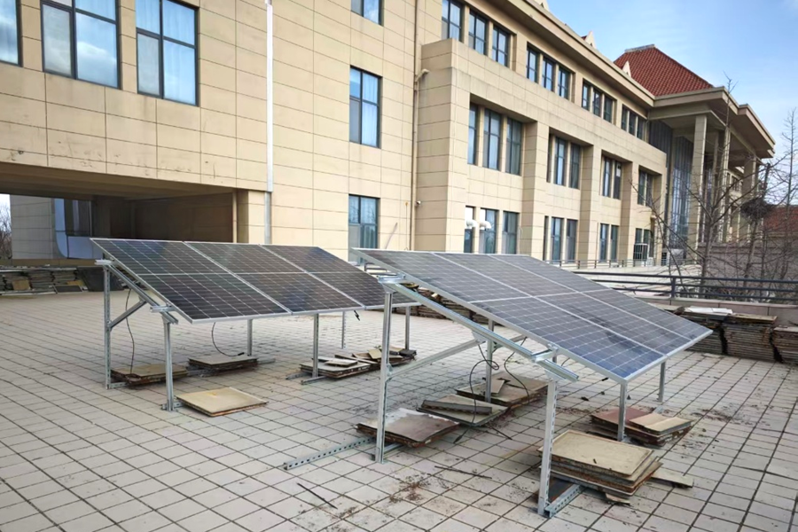 光伏电站主要包括三个部分:光伏板、逆变器、蓄电池。逆变器相当于电站的“大脑”,在白天光伏板给蓄电池充电,蓄电池和光伏板都接到逆变器上,晚上蓄电池通过逆变器输出,这就是分布式光伏电站的基本结构,实现24小时对外供电。构建最小光伏电站系统,即经逆变器连接一块光伏板和蓄电池,有输出电压且蓄电池也在充电,初步说明相关仪器还可以正常使用。接下来就是解决怎么放置六块大光伏板的问题了。