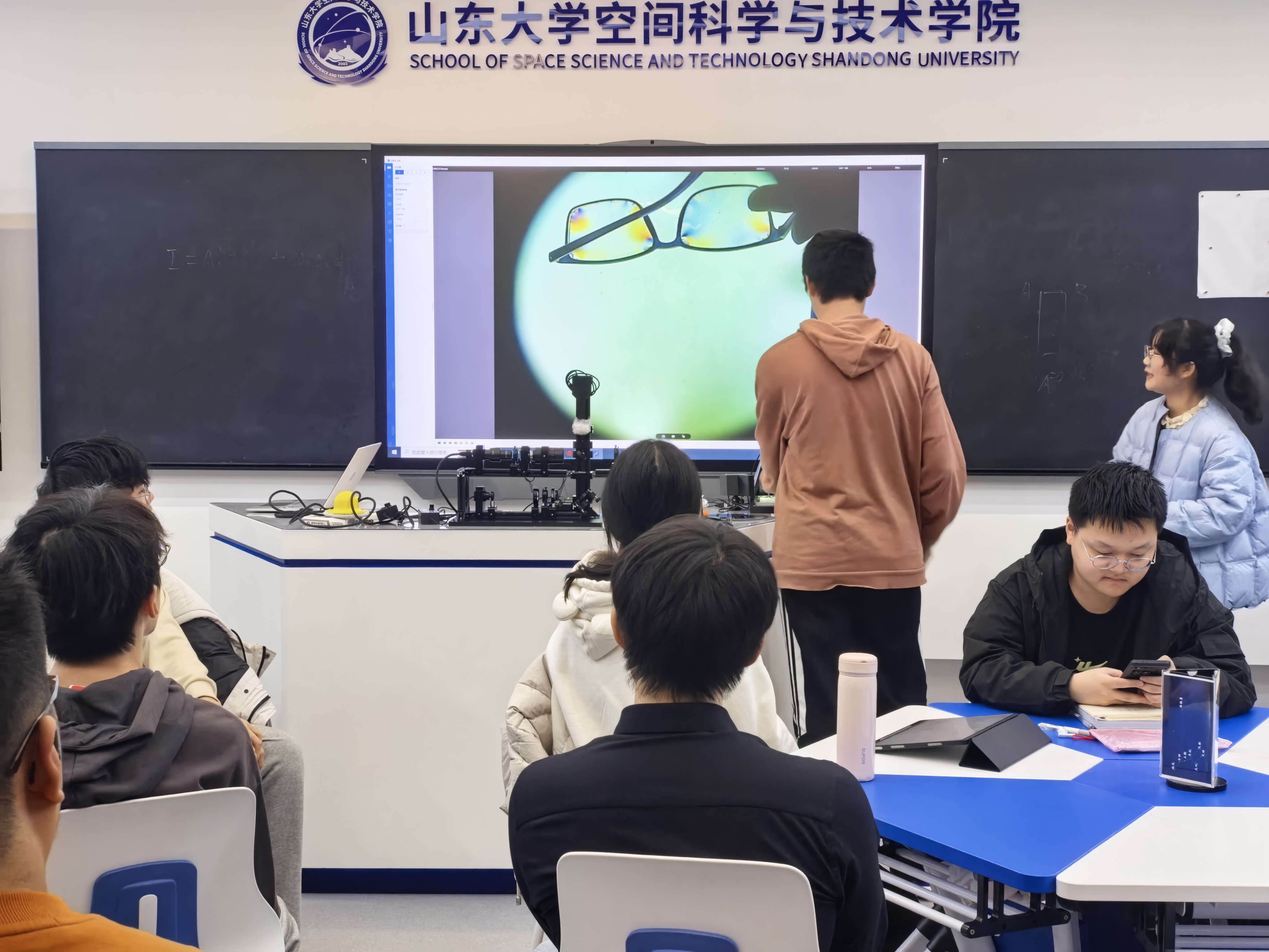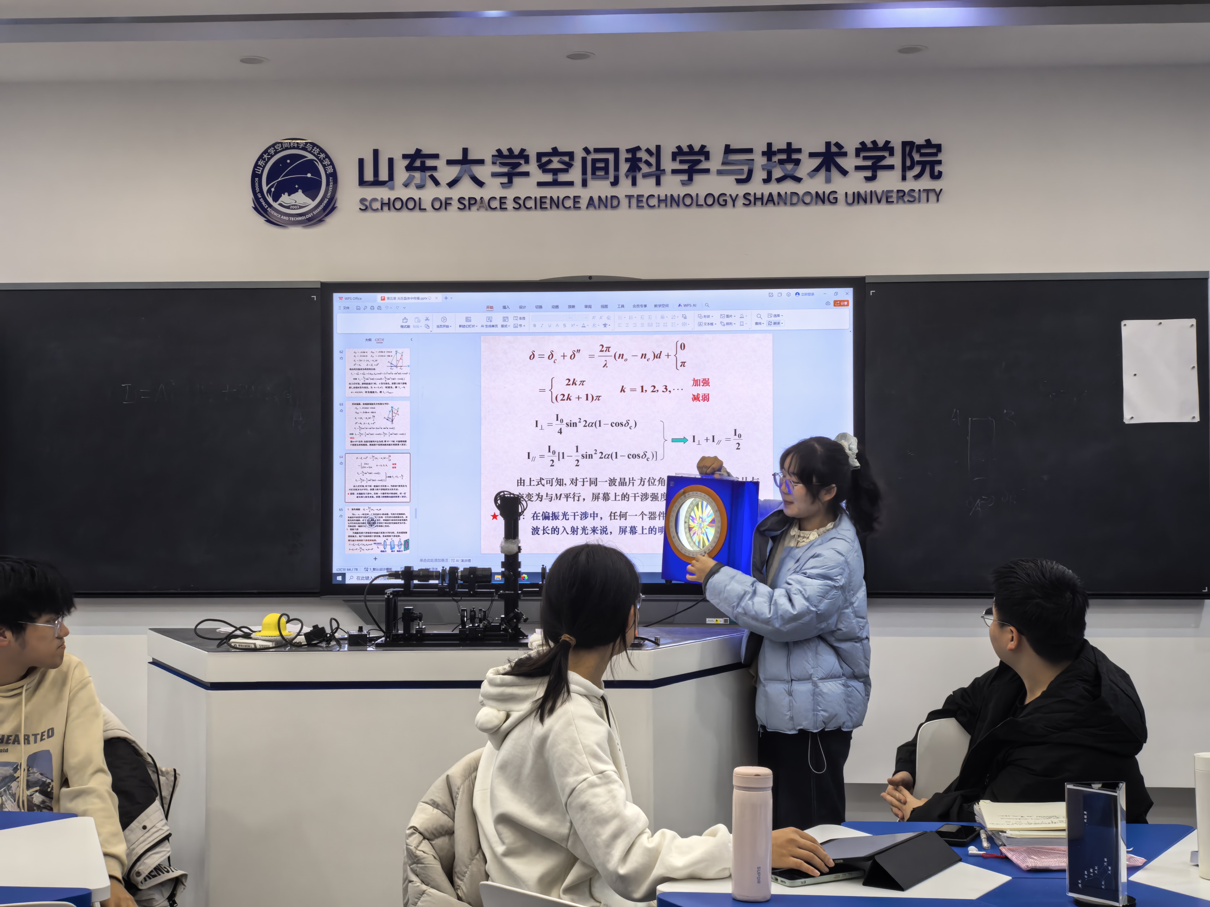 随着课程的推进,老师讲到偏振光的检验与晶体光学器件的应用,我便接过演示的接力棒。当两块偏振片的偏振方向垂直时,光屏上的光斑瞬间消失。教室里很安静,所有人都盯着瞬间变暗的光屏,仿佛在无声中与光的本质打了个照面。