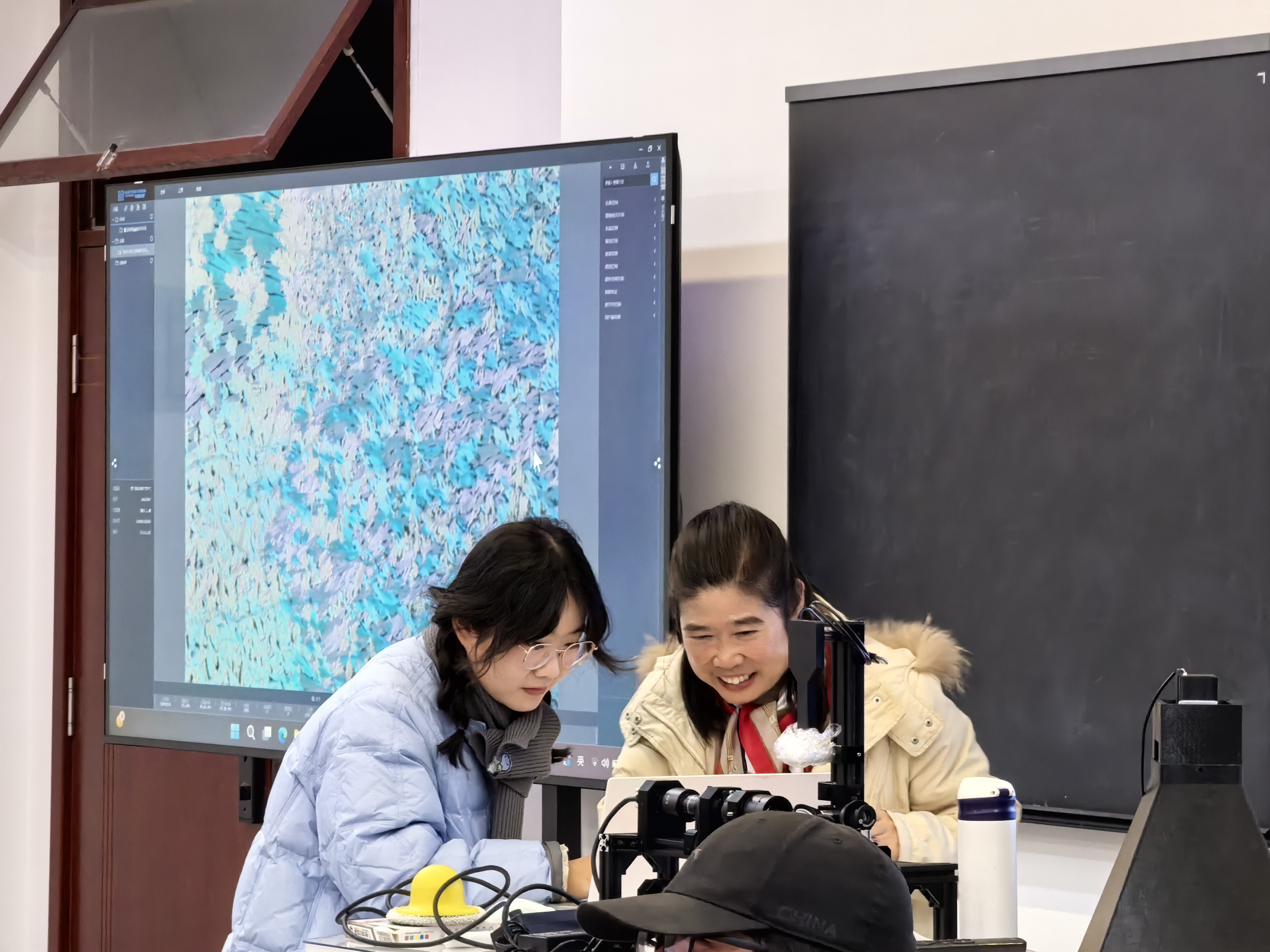 课间十分钟,成了实验展示的小高潮。我和另一位助教万新康轮流操作仪器:贴了胶带的亚克力板在偏振干涉系统里,转动装置,屏幕上忽然浮现变幻着的彩色条纹——那是应力导致的双折射现象;薄荷醇样本在冷却中逐渐析出晶体,屏幕上纹理由模糊变得规整,有同学小声说:“好像分子在排队呀!”大家都笑了。