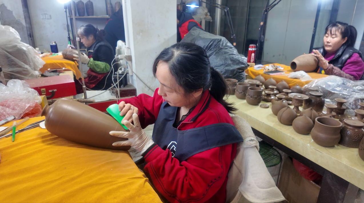 午后,我们前往刘德功黑陶艺术馆,刚踏入场馆,浓郁的陶土清香便扑面而来。这里与博物馆的静态陈列截然不同,处处洋溢着鲜活的创作气息。展厅内,传统与创新兼具的黑陶作品琳琅满目:既有纹饰典雅的古法器物,也有融入现代审美的时尚之作;制作车间里,手工艺人们专注投入,拉坯、刻纹、修形等工序有条不紊,师傅们指尖翻飞间,原本普通的陶泥逐渐绽放光彩,让我们深深折服于“一揉一捏见功底,一烧一炼出精品”的匠心精神。最令人期待的是亲手体验环节,在胡老师的耐心指导下,我们尝试拉坯制陶。看似柔软的陶泥实则“倔强”,重心不稳、力度不均等问题接踵而至,但伙伴们相互鼓励、分享技巧,在一次次失败与调整中,终于各自做出了简陋却珍贵的陶胚。抚摸着亲手制作的作品,一种敬畏感油然而生,真切体会到手工艺的珍贵与制作的不易。