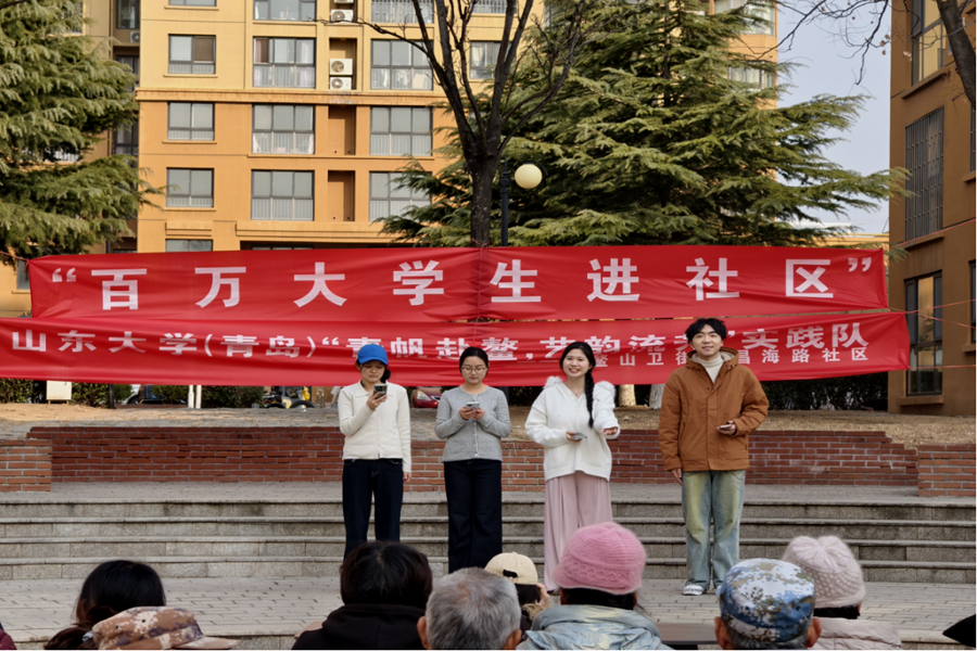冬日暖阳如碎金般洒落,驱散了清晨微寒,也照亮了我们前行的脚步。作为山东大学(青岛)“青帆赴鳌,艺韵流芳”实践队的一员,我们怀揣着对传统文化的热忱与传播初心,携带道具,前往鳌山卫街道昌海路社区开展艺术公益展演,让优秀传统文化在基层沃土绽放光彩。