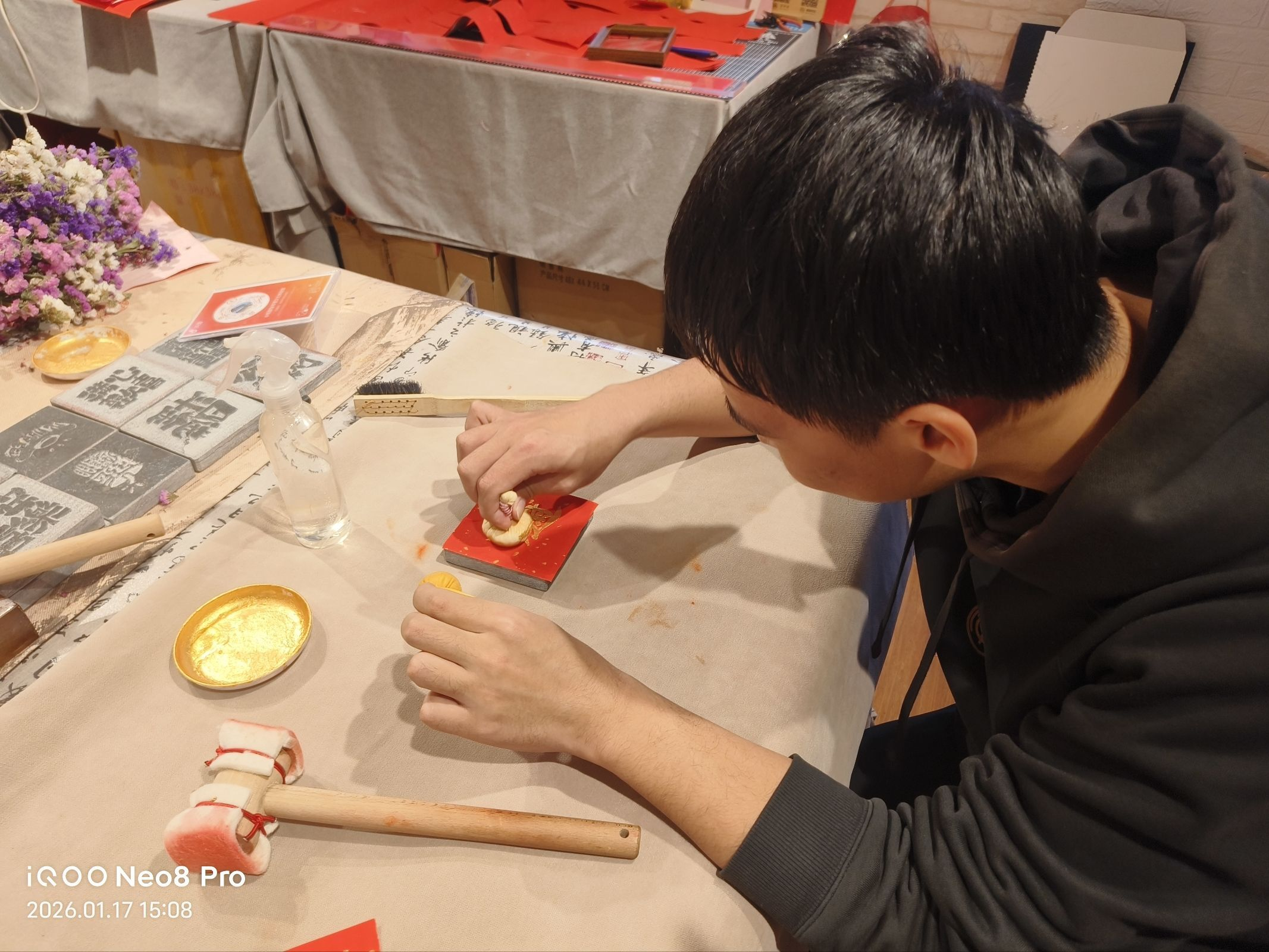 在老师的引导下,我们观摩古今拓片原件,了解其背后的历史与传承。随后,为了让大家把流程看明白,老师现场动手演示。她把一张红色洒金纸铺在刻着图案的石版上,先用喷壶薄薄喷水,再用小锤子从中间往四周轻轻敲打,纸很快贴住版面,为使细节更加清晰,再用棕刷轻轻敲打。接着蘸着墨的拓包在她手里来回轻拍,墨从浅刭深,不到五分钟,图案就清清楚楚显在纸上。
