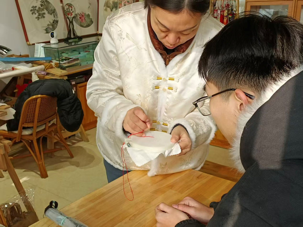 推开店门,清幽的生丝香气与满屋琳琅的绣品映入眼帘。工作室创始人戎玉蕊老师是国家级鲁绣非遗项目代表性传承人,她温和地向我们介绍着鲁绣。鲁绣与苏绣追求油画感的细腻不同,它以蚕丝线为墨,生丝为底,主打中国传统水墨画的淡雅意境。在戎老师指导下,我尝试拿起了绣花针。体验了“散套针”技法后,才深感“台上一分钟,台下十年功”,每一针的走向都决定了荷花花瓣的灵动。