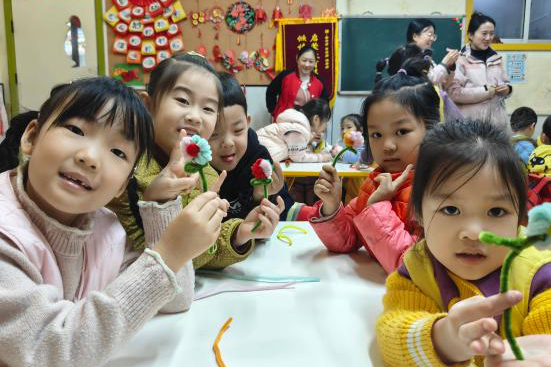 不知不觉,课程接近尾声。孩子们举着自己的作品围过来展示,有的是娇俏的小花,有的是灵动的小柿子,每一个都藏着童真的创意。幼儿园老师笑着跟我们说:“孩子们第一次接触绒花,又动手又长见识,这堂课太有意义了。”收拾教具时,队员们的衣服上沾了不少绒丝,手上也蹭到了彩色痕迹,但每个人脸上都洋溢着满足的笑容。