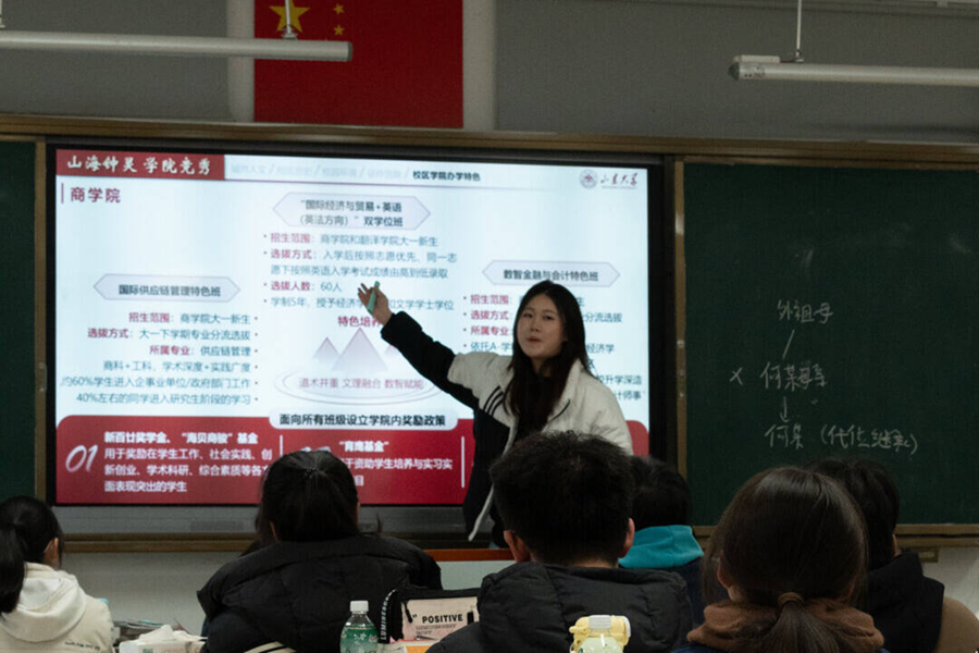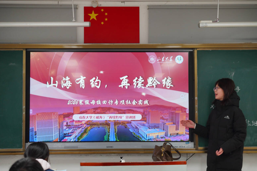 推开高三(3)班的教室门,喧闹声戛然而止,几十双清澈又带着期待的眼睛齐刷刷望过来。我走上讲台,身后的屏幕亮起山东大学威海校区的标志性画面——湛蓝的海与红瓦的楼相映成趣。我们先从校区的海边步道、特色社团聊起,丰富的大学校园生活回忆涌入我的脑海,看着台下一张张露出向往神色的脸庞,原本的紧张慢慢消散。