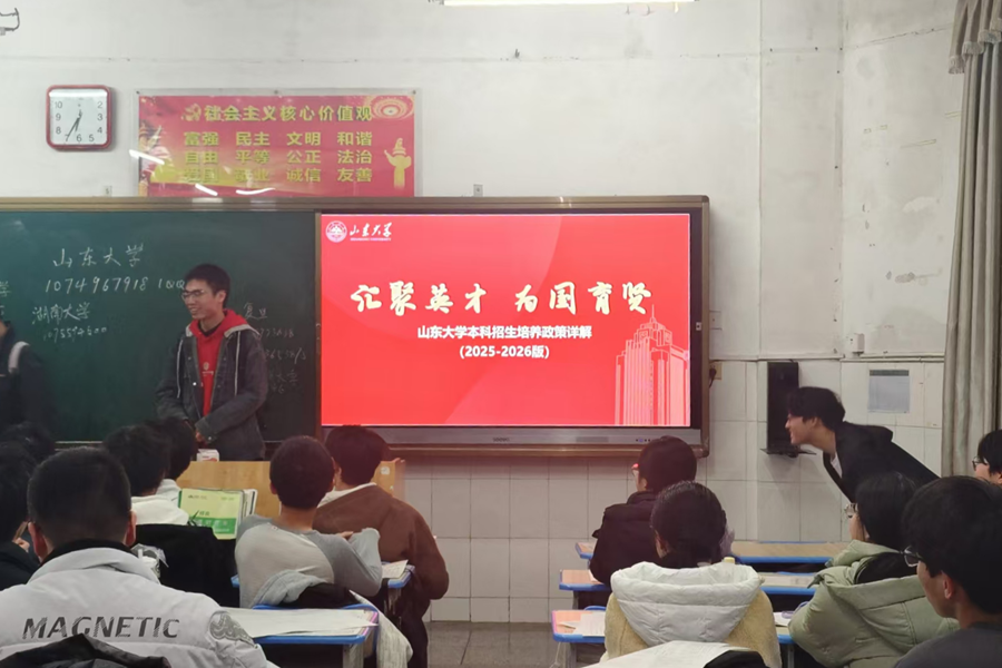 今夜,我们走进五个高三班级,面对250多双眼睛。我们不仅带去了2026年招生政策、强基计划、综合评价等“硬核”信息,更将“泰山学堂”“崇新学堂”等育人平台娓娓道来。为了让知识“活”起来,我们同时埋下“彩蛋”——校史冷知识、备考心得、大学生活碎片……在笑声与掌声中,我看见他们眼中跳动着光,那光里,有好奇,有向往,也有曾经的我们自己。互动时,一位同学举手问道:“学长,如果家庭经济条件一般,山大的资助政策能覆盖学费和生活费吗?”我们立刻停下进程,郑重而详细地介绍了学校“奖、助、贷、勤、补”的全方位保障体系,尤其强调了“不让任何一位学生因经济困难而失学”的承诺。
