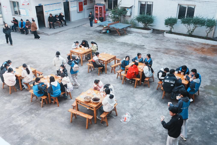上午九时,孩子们结束第一节课后,我和我的5名队员便带着32名学生,开启了一场满载暖意的敬老之旅。我们徒步前往镇上的敬老院,用亲手包的饺子、熬制的腊八粥和红彤彤的春联,为老人们送去冬日的暖意。