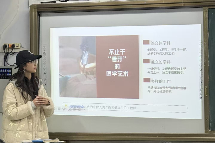 在第二天的专业宣讲会,我以“不止于‘看牙’的医学艺术”为主题,为学弟学妹们介绍口腔医学专业。当展示被同学们戏称为“蓝色生死恋”的专业教材时,台下响起阵阵笑声,让大家对医学专业有了更真切的认识。