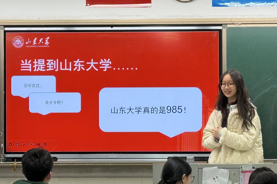 正式宣讲的一天忙碌而充实。漫步校园,学弟学妹们纷纷投来目光,那眼神里闪烁的好奇与憧憬,仿佛让我看见了曾经那个同样望向宣讲学长学姐的自己。我们分年级开展进班宣讲,我在高一专场以趣味话题破冰,讲述山大校史与办学理念,黑板上“情系母校 欢迎回家”的粉笔字,搭配文创礼品,让教室满是温情;队员在高二专场拆解强基、报考政策;而高三专场则聚焦报考技巧与冲刺经验,分享备考方法与心态调节技巧,为即将高考的他们注入前行信心。
