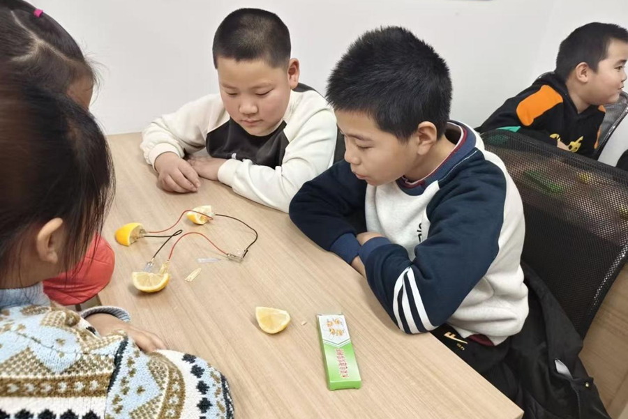 实验环节,我将孩子们分成几个小组,队友们迅速就位,各自负责指导。我一边巡视,一边观察着每个孩子的反应。辛明阳正蹲在一个小组旁,手把手教一个小男孩如何把锌片和铜片分别插进柠檬里;王志坤在另一组,耐心地解释为什么两片金属不能碰在一起;田家骏和朱永康那边传来了兴奋的低呼——他们那组的小灯泡第一个亮了起来。