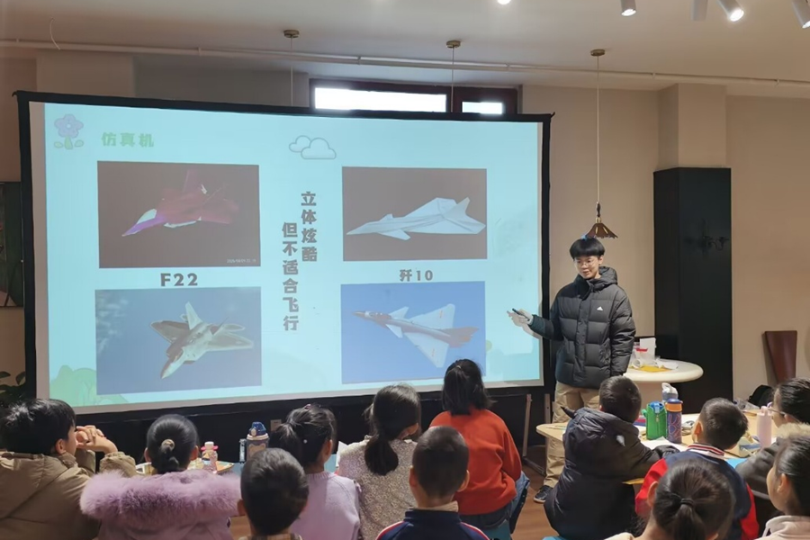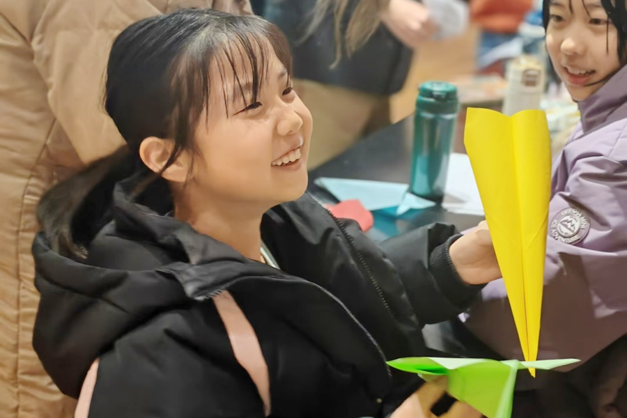 经过短暂的开营仪式,我的授课正式开始。今天,我讲授的内容是折纸飞机。我先是进行了一个小小的纸飞机展示。幕布上各种纸飞机的图片一一闪过,原本安静的教室逐渐被七嘴八舌的讨论声占据。我又从材料箱里拿出几架形状“古怪”的飞机,逐个试飞。当我掷出的一架飞机转了一圈,又回到我的手中时,教室里响起了阵阵掌声。