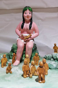 所有泥塑中,和女娲伏羲文化关系最密切的,就是工作人员向我展示的伏羲女娲的挂件(分别存有12件),以及怀旧生活场景打造系列的女娲造人、女娲补天、伏羲画卦(分别存有1件)。244件留存成品、24套模具,将传统技艺与时代审美相融合,让游客在参与抟土造人的过程中,铭记始祖女娲“始置婚姻”的功勋,传承“泥塑”这一珍贵的非物质文化遗产。