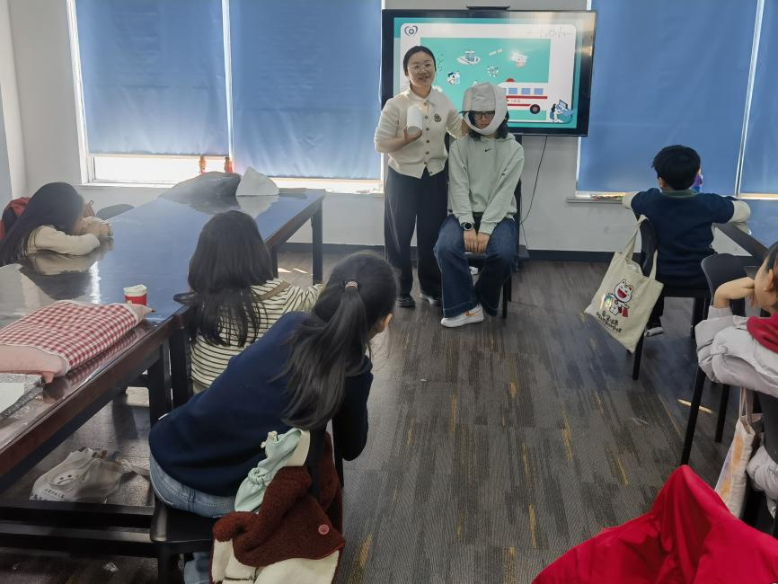 队友用卫生纸演示包扎伤口。卫生纸缠上我的手臂时,小同学们都聚精会神地看着队友用专业的手法演示环形包扎、螺旋包扎。队友一边操作一边讲解:“第一圈要压住绷带头”“压力要均匀,不能太紧也不能太松”。那卷普通的卫生纸在她手里仿佛真的变成了救死扶伤的绷带,将高深抽象的专业知识转化为真实可感的实际操作,将生命急救知识灌输给小同学们。