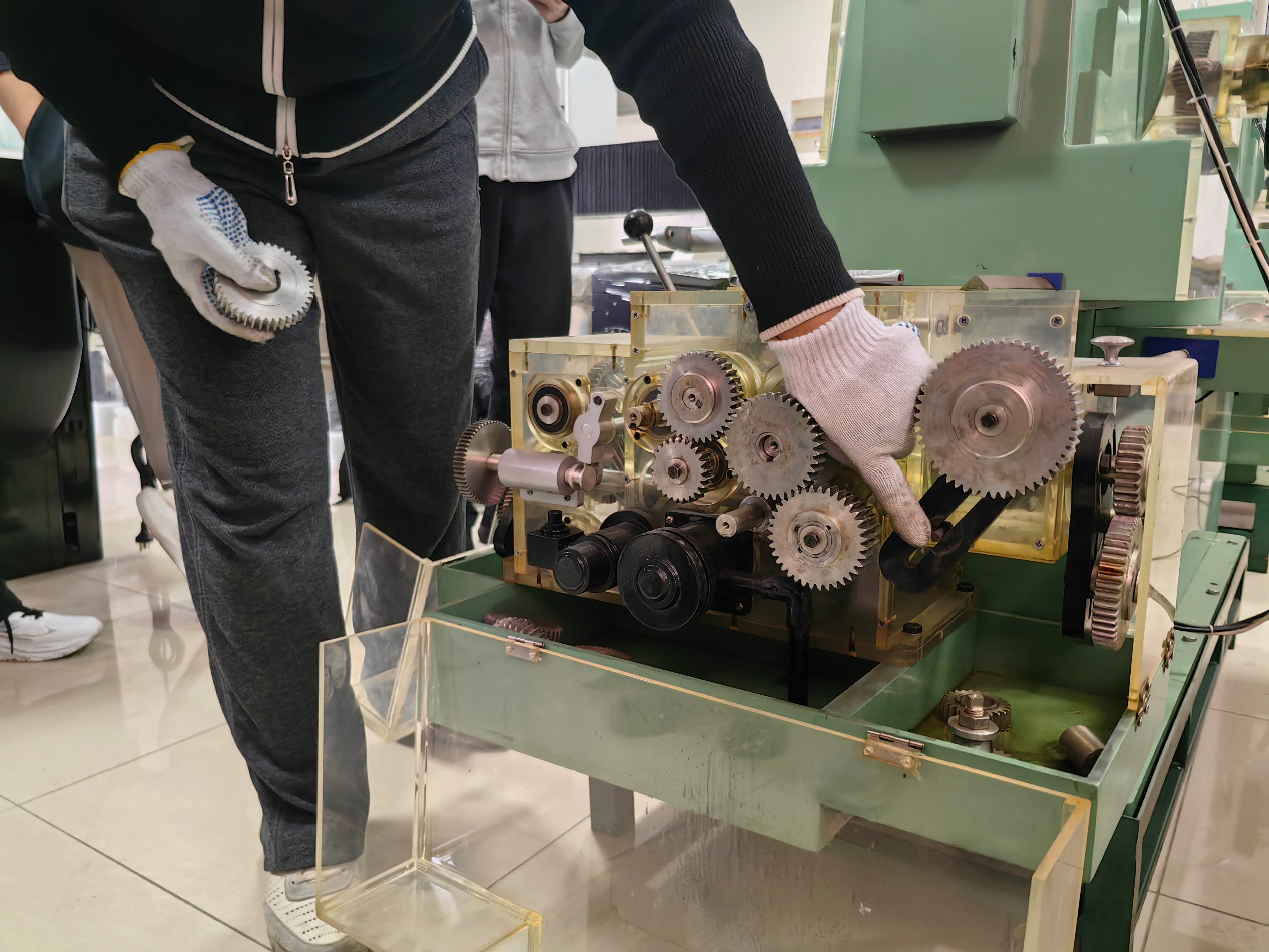 刚进实验室,我就被一排排透明外壳的齿轮变速机构吸引了。老师先带着我们拆解了变速机构的原理,我蹲在机器旁,看着同学操作手柄、调整齿轮啮合。不同大小的齿轮啮合,转速就会跟着变化,大齿轮带动小齿轮,转速瞬间提升,小齿轮带动大齿轮,就能输出更大的扭矩,这种看得见、摸得着的机械,比书本上的推导好理解太多。我伸手摸了摸齿轮的齿面,能感受到加工留下的细微纹路,也明白了变速机构对插齿机的重要性。只有精准控制转速,才能保证齿轮加工的精度。