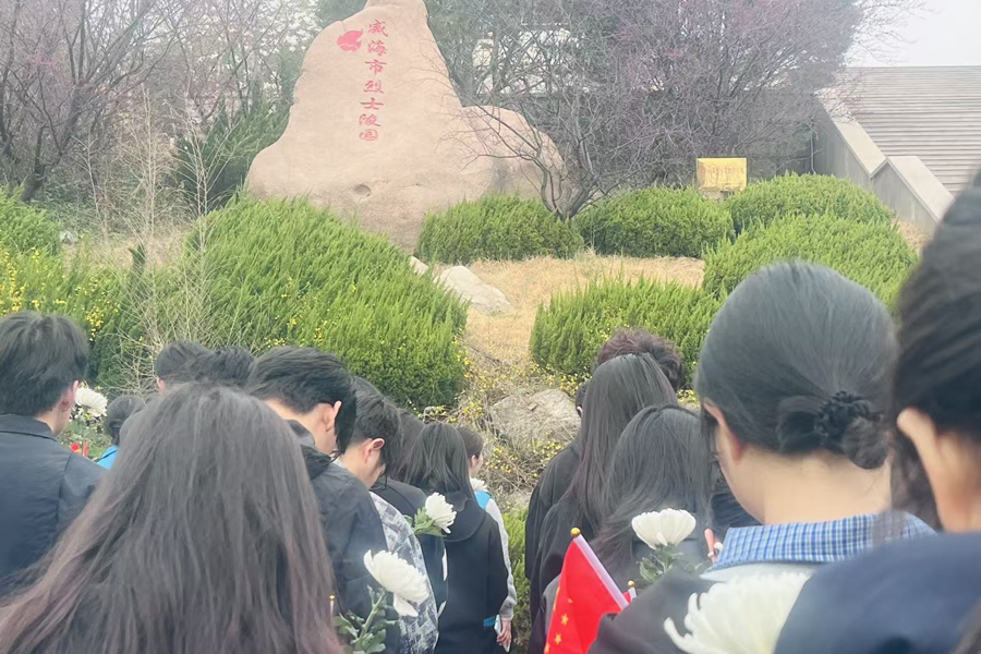 九点整,我们每个人都握着红旗白菊,列队走进威海市烈士陵园。跟着领队的指示,三鞠躬,默哀三分钟。我微低着头,耳边风声渐消,心声却翻涌起来。脑海里闪过“正青春”排练时标记过的马石山战役的突围,古陌岭阵地战的炮火,那些英雄儿女当年的血泪,铺就了今天祖国的强盛与繁华,也为我们青年薪火相传、接续征程提供了源源不断的动力。