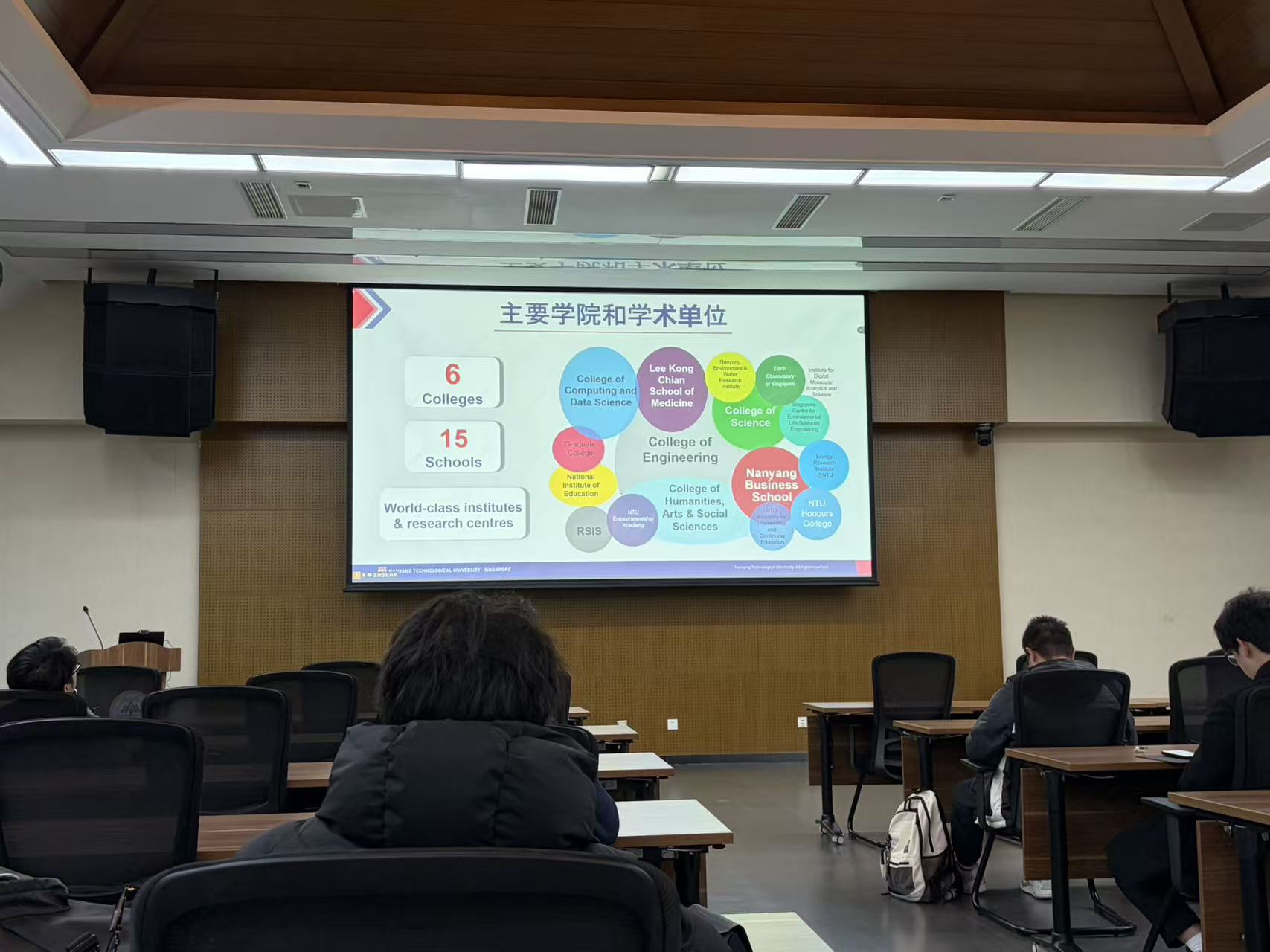 昨天傍晚六点半,我准时来到了青岛校区华岗苑北楼的五层报告厅。推门进去找位置坐下时,我注意到最前面的大屏幕已经亮起。仔细一看才发现,这次的“山海知行”宣讲会是济南、青岛、威海三地同时连线进行的。主讲人——NTU研究生项目推广与招生负责人郑汉秦(Alvin Tay)老师在济南中心校区线下主讲,而我们青岛和威海校区则通过屏幕同步收听。