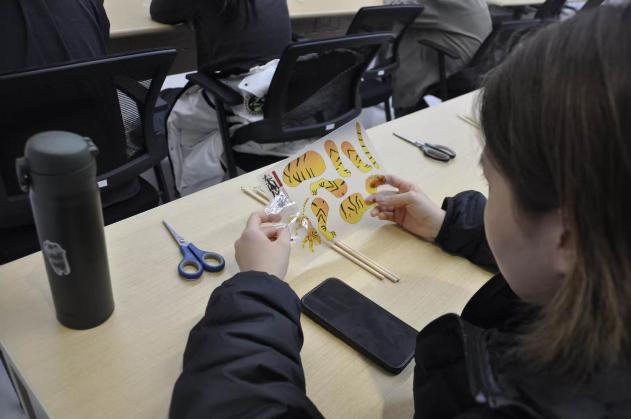 下午1点,我们提前到教室布置现场。搬桌椅、摆刻刀颜料、分好皮影坯子。忙完一切,看着整齐的场地,我心里满是期待。两点时,活动准时开始,同学们陆续走进教室,围坐在桌前。我们先简单介绍了国际珍稀动物保护日的意义,又分享了皮影戏的历史与工艺,随后便引导大家动手制作藏羚羊、黑狼等濒危动物主题皮影。