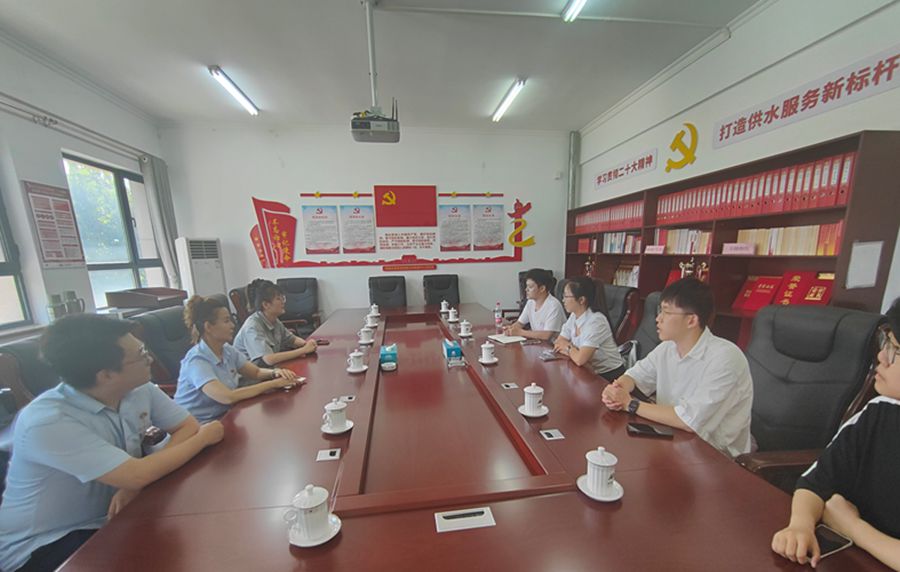 随后,我们与济南水务集团客服中心党支部进行交流座谈。党建是国有企业发展的“根”和“魂”,客服中心综合科科长毛晓宁介绍了集团内部党支部的架构组成以及本支部情况,分享了支部建设经验。金智炜以自身军旅生涯和集团工作经历为例,表示集团成员始终高举“四面旗帜”,集团党员始终坚守初心,“供”好水、供“好”水,为服务泉城人民用水贡献力量。王青天、李扬也对积极向党组织靠拢的青年大学生表达了认可与期望,表示希望调研团成员不忘嘱托、发挥榜样作用,从学习和工作两个方向发力,矢志不渝跟党走、奋力建功新时代。