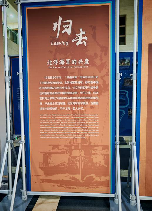 这次展览对我意义非凡。它让曾经所学的历史书上冰冷的文字化为可触、可感的活生生的实例,那一张张照片,承载着是多少代人的心血与努力啊!从北洋军队的创办,到考古人员的发掘,再到新时代中国辽宁舰、山东舰、福建舰等的辉煌,浸透的是历史的回音,是时代的呼唤。正如结语所言:“铭记历史,警钟长鸣。中华复兴,日月逾迈,永矢弗谖。”归去来兮,历史从未远去。