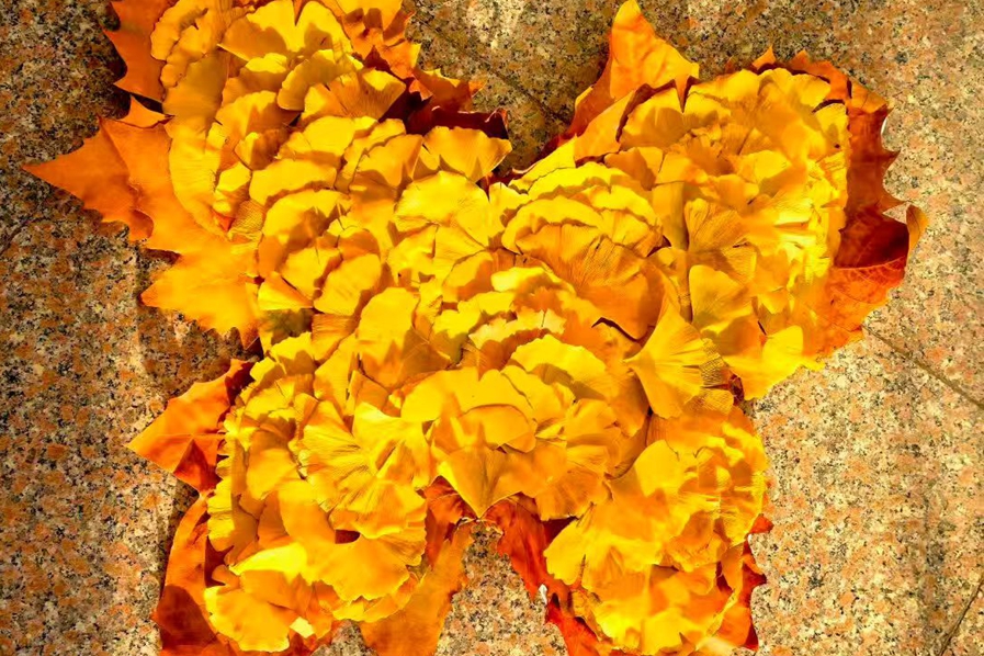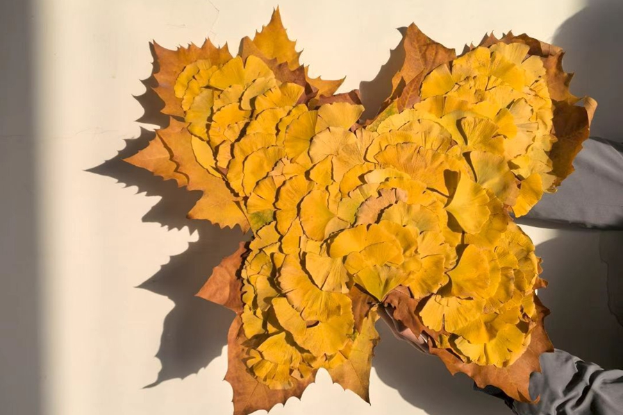 拾叶归来,我们便迫不及待地投入到手工艺品的创作中。我的伙伴们先尝试制作叶画,将银杏叶铺成连绵的金色山峦,再用其他五彩缤纷的落叶点缀,一幅秋日山林图便缓缓“生长”出来。旁边的同学则在钻研叶制花朵,她将银杏叶仔细折叠、粘贴,层层叠叠间,一朵金黄的“玫瑰”悄然绽放,搭配着周围五彩的落叶,竟有了别样的雅致。