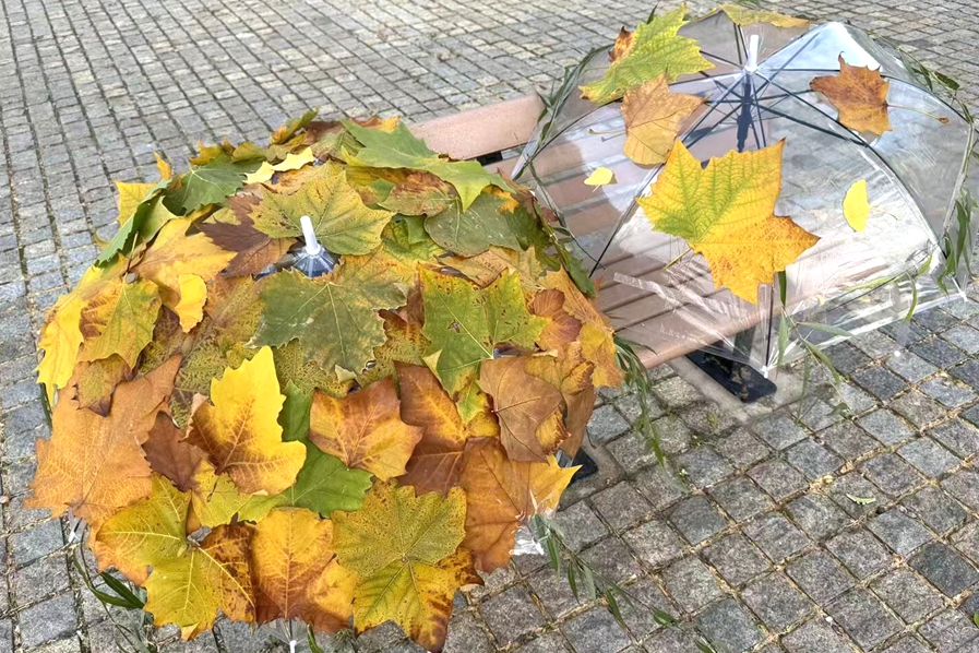 当所有作品完成,我们将它们一一摆放在树下的长椅附近。银杏叶堆成的小山、落叶拼成的玫瑰、还有那顶别致的落叶帽和叶子伞,吸引了不少同学驻足观赏。阳光透过稀疏的枝叶洒在作品上,也洒在我们含笑的脸上。