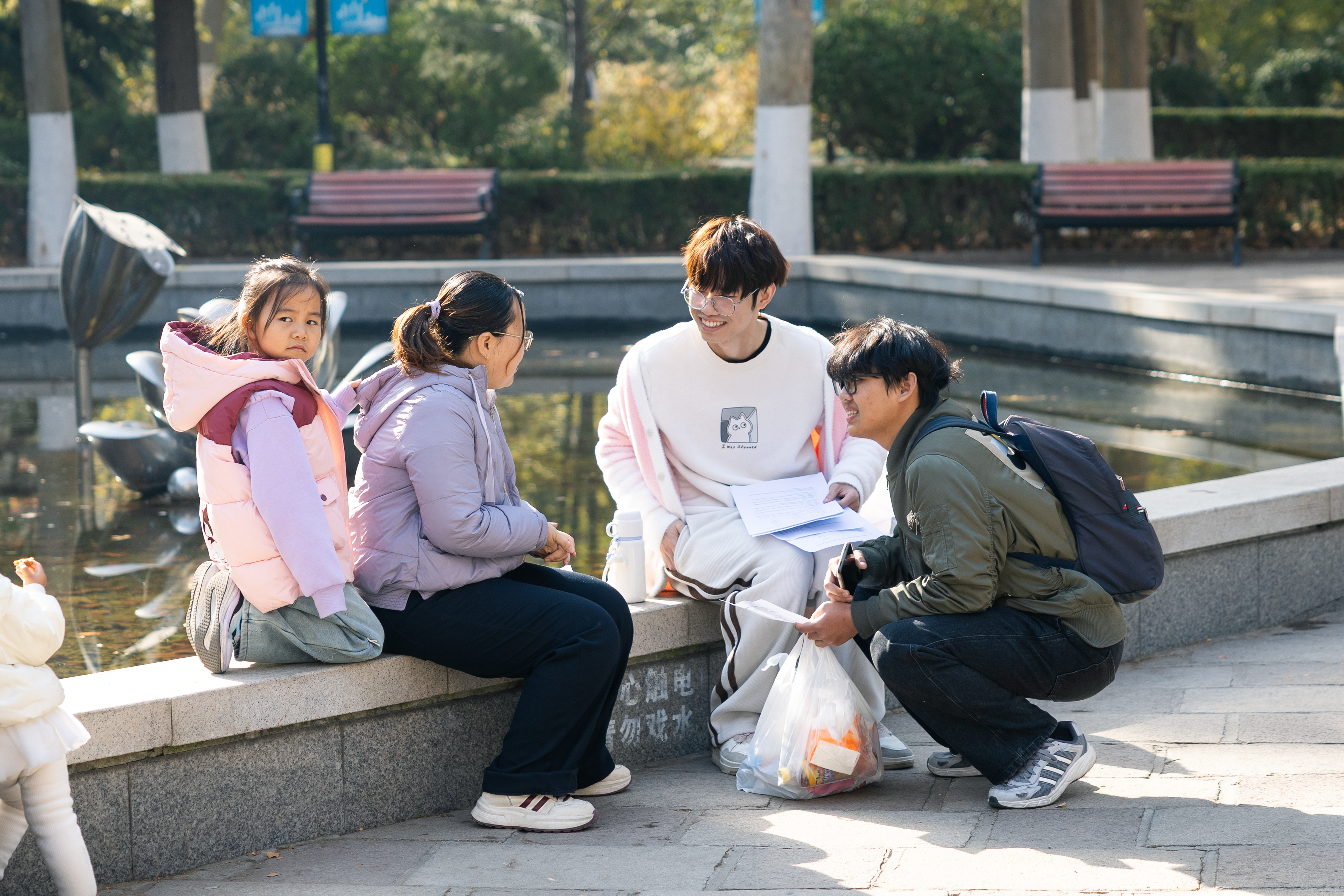 走出党群服务站,班级分成小组深入社区开展专题调研。正值早市,社区街巷格外热闹,招呼,交谈,笑声……孩子们在小公园里跑着,游戏着;老人们在小广场上晒着太阳,悠闲地聊天说地……踏入闵子骞社区,阳光和温暖,驱散了秋日的微凉与路途的疲惫。