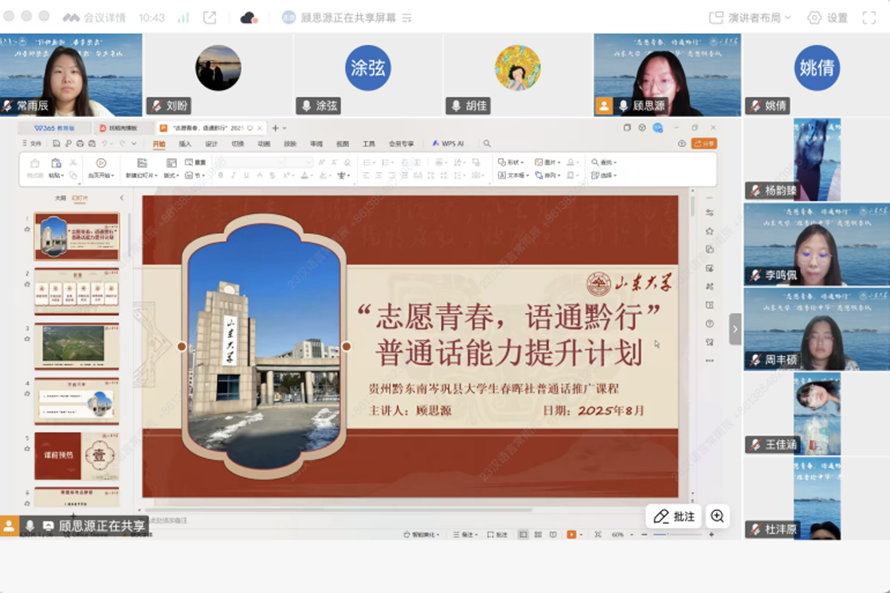 我们的战场,不仅在田间地头,也在数字云端。在贵州岑巩,我们为大学生春晖社打造线上趣味课堂:课堂伊始,我们重温习近平总书记今年三月在贵州黔东南州考察指示精神,也认识到推广普通话对宣传贵州、构建沟通桥梁至关重要。从岑巩特色农产品“思州柚”引入,我们总结普通话水平测试题型与重点,整理常见平翘舌音、前后鼻音词汇供同学们练习,还把黔东南文化符号变为推普“活教材”,设置“情景模拟工坊”环节,让大家在文旅服务与助农直播模拟中克服发音障碍、建立信心。大家积极参与,讲述经历、介绍历史。在流利清晰的普通话中,我们看到大家语言进步与对家乡的热爱。科技,让我们的推普工作插上了翅膀,飞得更高、更远。