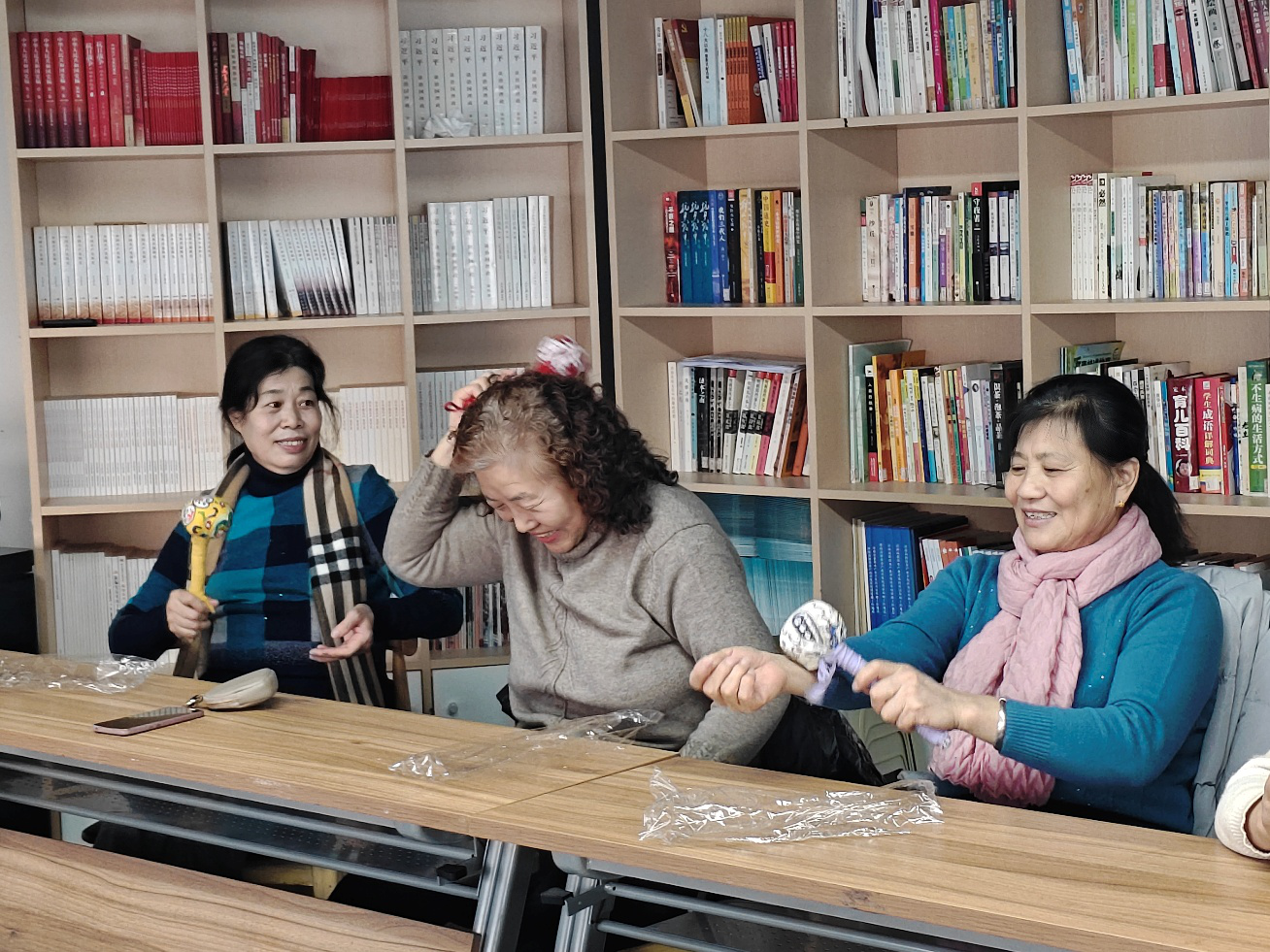手工环节伊始,我们分发木质锤柄、老粗布、艾草包和棉线。我边示范边讲解:“把木棍插进艾草包,用粗布裹紧锤头,拍至圆润,再用棉线缠牢即可。”还提醒大家每日敲肩颈腰背10至15分钟,温通经络驱寒。队友们穿梭协助,有阿姨穿线困难,队友便手把手教;一位奶奶还巧思缠出提环,十分精致。艾草清香漫溢,屋内暖意更浓。